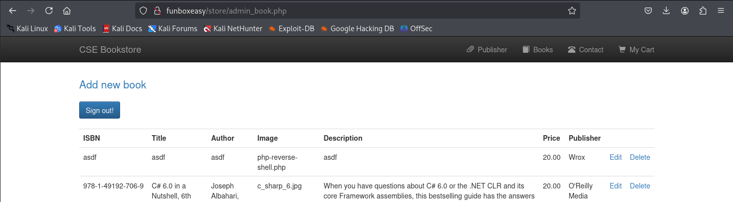 http://easy/store/admin_edit.php?bookisbn=978-1-49192-706-9 -> Changing the book file to php-rev-shell.php here⦠Make sure to set the right publisher_id to successfully add a new book, refer to the database.